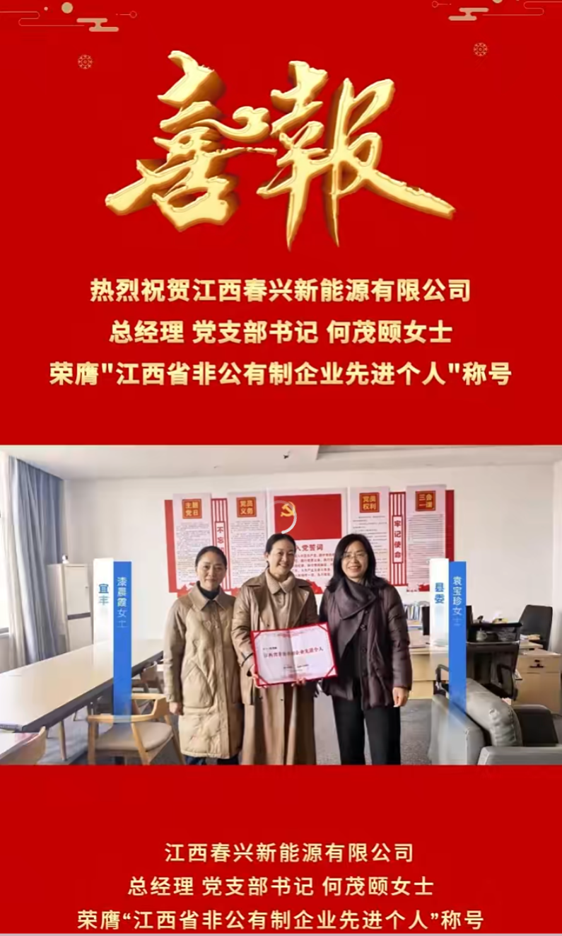 近日,从江西省发展非公有制经济表彰大会传来喜讯,江西春兴新能源有限公司总经理、党支部书记何茂颐女士荣膺"江西省非公有制企业先进个人"称号。这一荣誉由中共江西省委、江西省人民政府联合授予,旨在表彰在非公有制经济发展中做出突出贡献的个人,彰显了何茂颐女士在推动地方经济发展和行业进步中的卓越成就。
